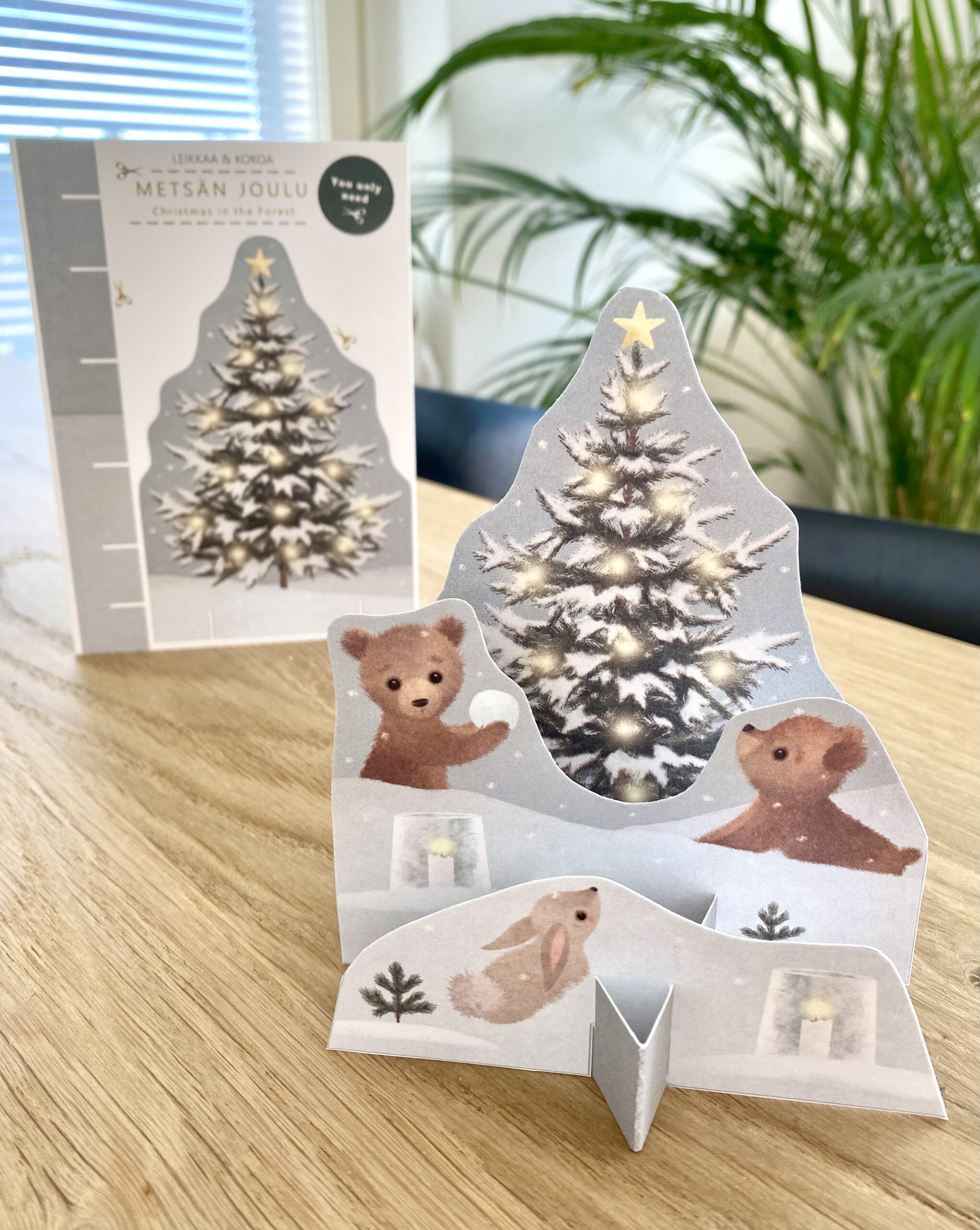 Leikkaa ja kokoa -kortista kortin saaja saa halutessaan leikata siitä pöytäkoristeen. Ei vaadi liimaa ja ohjeet kokoamiseen löytyvät suomeksi ja englanniksi kortin kääntöpuolelta.