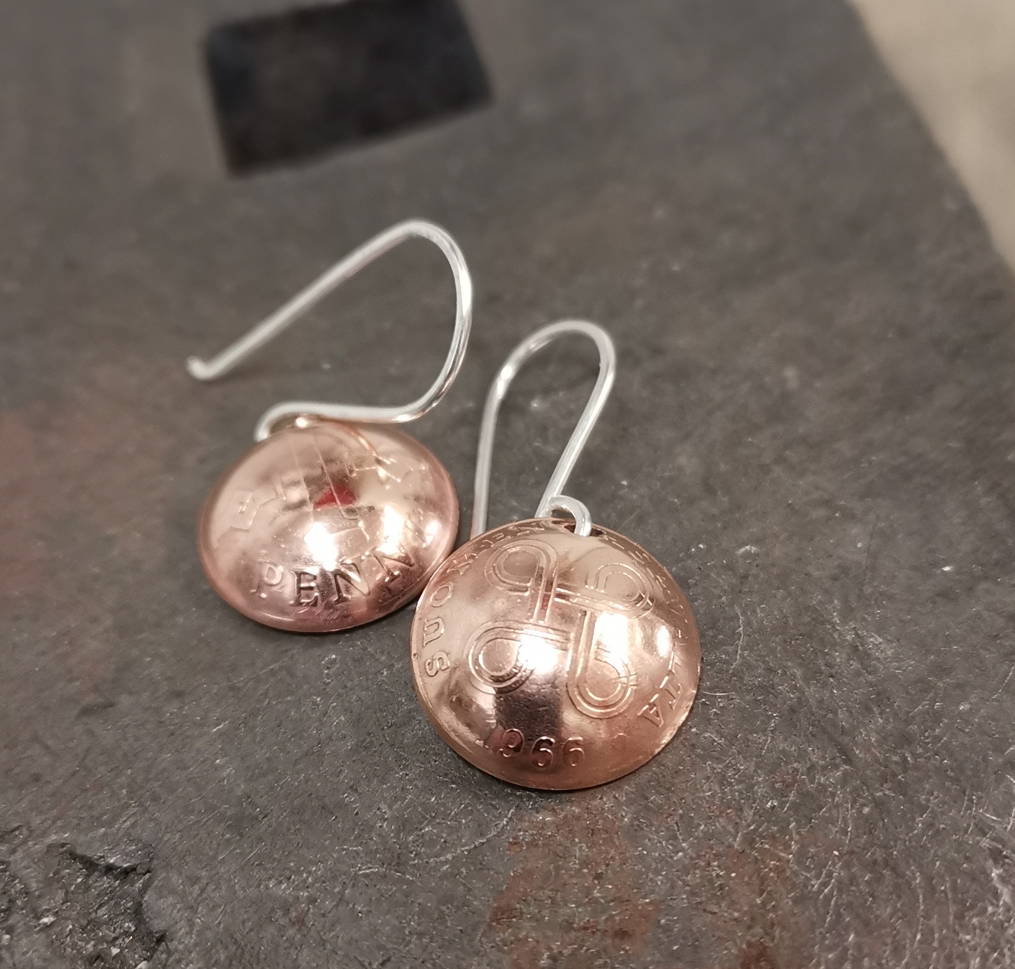 Vuoden 1966 kuparisista pennin kolikoista valmistetut riippuvat korvakorut. Toisessa korvakorussa päälläpäin on kolikon arvopuoli, toisessa vuosiluku ja hannun vaakuna. Koukut ovat 925-hopeaa. Kolikko on halkaisijaltaan 16mm.