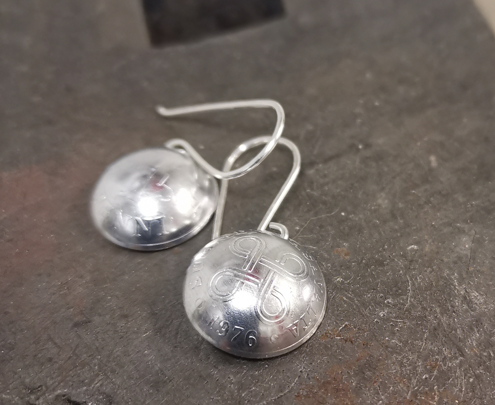 Vuoden 1976 alumiinisista pennin kolikoista valmistetut riippuvat korvakorut. Toisessa korvakorussa päälläpäin on kolikon arvopuoli, toisessa vuosiluku ja hannun vaakuna. Koukut ovat 925-hopeaa. Kolikko on halkaisijaltaan 16mm.